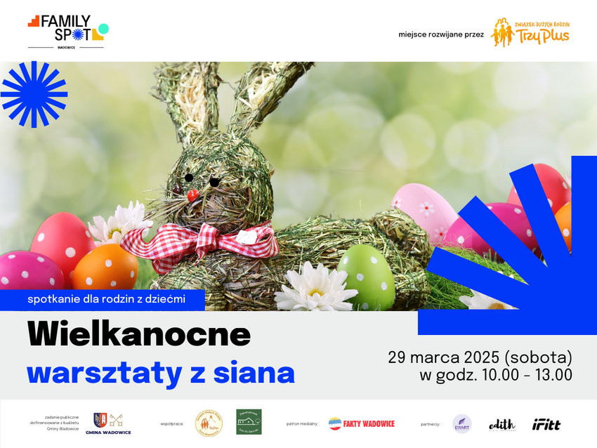 Serdecznie zapraszamy rodziny na pierwsze spotkanie w ramach projektu #FamilySpotWadowice pt. Wielkanocne warsztaty z siana". Zajęcia prowadzą Pan Michał Tyrała i Pan Mariusz Tyrała.